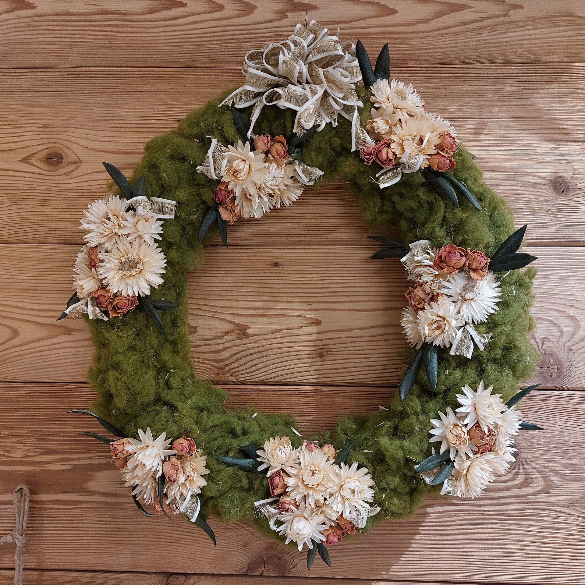 Coroncina in panno verde decorata con Elycrisum bianchi secchi, roselline secche e ulivo stabilizzato